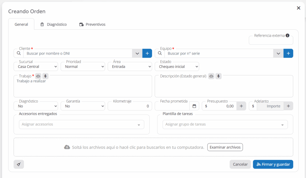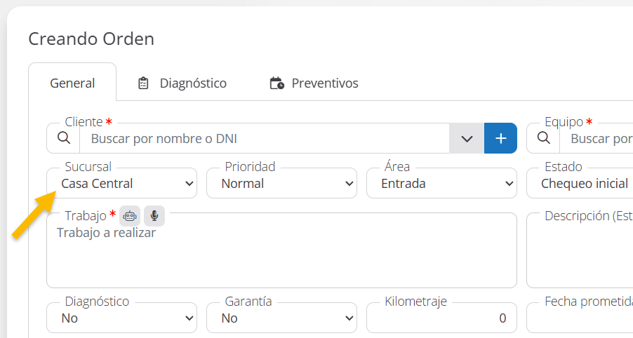 En los casos donde la orden se cree desde una cotización, un preventivo o directamente desde el módulo de taller, el sistema seleccionará de manera automática la sucursal asociada al origen del registro, evitando errores y manteniendo la coherencia operativa.